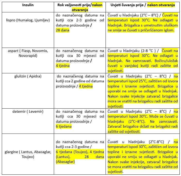 U sljedećoj tablici su prikazane informacije o skladištenju inzulina iz Uputa o lijeku za inzuline dostupne u Hrvatskoj.