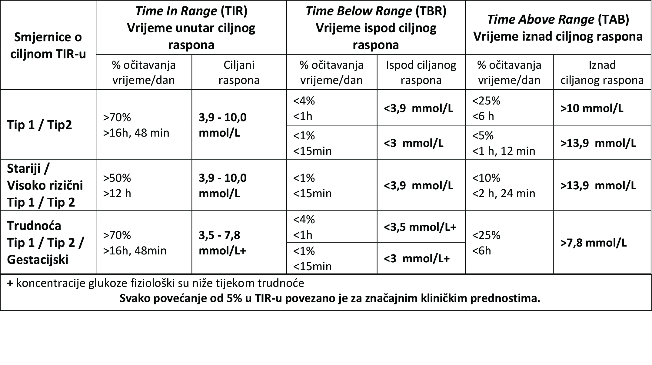 Međunarodni konsenzus o TIR ciljevima preporučuje ciljani raspon od 3,9 – 10,0 mmol/L za osobe s dijabetesom tipa 1 i dijabetesom tipa 2, i 3,5 – 7,8 mmol/L tijekom trudnoće, zajedno s nizom ciljeva za vrijeme na dan (+ koncentracije glukoze fiziološki su niže tijekom trudnoće). Preporuke također opisuju postavljanje konzervativnih ciljeva za osobe s dijabetesom koje su starije i/ili se smatraju visokorizičnima, s jakim fokusom na smanjenje postotka vremena provedenog < 3,9 mmol/L i na sprečavanje pretjerane hiperglikemije. Skupina za konsenzus također je naglasila da je jedan od važnih načina uvođenja ovih novih ciljeva u kliničku praksu provedba standardnog izvješća poput ambulantnog profila glukoze (AGP izvješće).